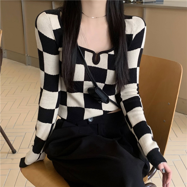 - 스퀘어넥 체커보드 패턴 니트 티셔츠 z27198